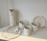 Myrtille, la céramiste, travaille la terre comme un graphiste travaille une page blanche. Laurence, la peintre, a apprivoisé la matière à son tour, découvrant pour la première fois les rouages de cet artisanat ancestral. Sur les assiettes pures de Myrtille, Laurence dépose ses pétales modelés.